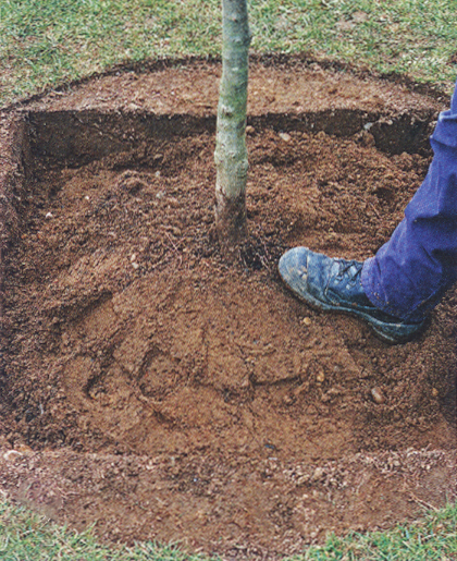 Scavate un buco largo almeno tre volte il diametro del pane radicale e profondo almeno 50 cm. La terra dello scavo deve essere accumulata per strati: il terzo superiore da una parte, il terzo mediano in un'altra, il terzo inferiore ancora a parte, e nel riempire il buco rispettate l'ordine degli strati, di modo che siano salvaguardate le condizioni dei microrganismi riguardo all'ossigeno (aerobi e anaerobi). Aggiungere compost da giardino può portare a un indesiderabile assestamento del terreno dopo l'impianto, pertanto è meglio evitare, a meno che il terreno non sia davvero povero di nutrienti. Se necessario, si può aggiungere del fertilizzante la stagione successiva.