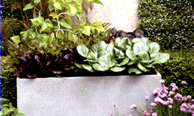 Cavoli, lattughe a foglia rossa e un fagiolo rampicante: un trio divertente e gustoso nella vasca qui sopra a sinistra. Per coltivare zucche e cavoli si possono invece usare anche delle cassette in legno del tipo di quelle da frutta (a destra)) o dei bidoni di metallo, ovviamente sempre ben puliti e dotati del necessario drenaggio. |